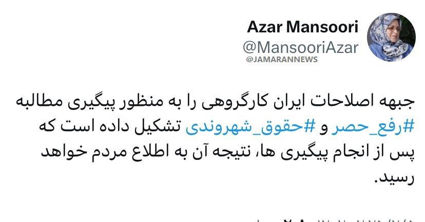 🔹 جبهه اصلاحات کارگروه مطالبه رفع حصر و حقوق شهروندی تشکیل داد.