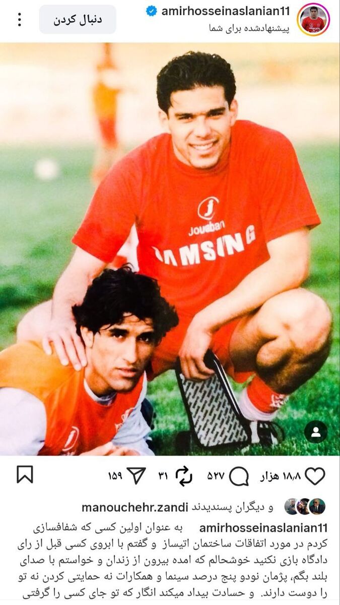 مهاجم اسبق پرسپولیس که با خود پژمان در این تیم همبازی بوده، در همین خصوص متن جدیدی در فضای مجازی منتشر کرد و نوشت: