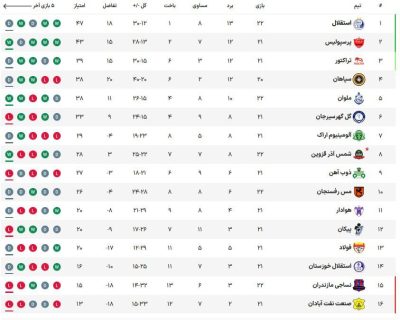 🔹 جدول لیگ برتر پس از پایان روز اول از هفته بیست و دوم