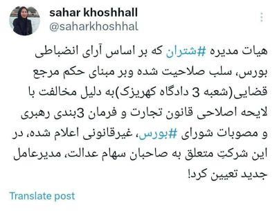 خبرنگار بورس۲۴ در توییتی نوشت: هیات مدیره شتران که بر اساس آرای انضباطی بورس، سلب صلاحیت شده و بر مبنای حکم مرجع قضایی(شعبه 3 دادگاه کهریزک) به دلیل مخالفت با لایحه اصلاحی قانون تجارت و فرمان 3 بندی رهبری و مصوبات شورای بورس، غیرقانونی اعلام شده است، در این شرکت که متعلق به صاحبان سهام…