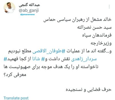 عبدالله گنجی فعال رسانهای اصولگرا در شبکه اجتماعی اکس نوشت: 🔹خالد مشعل، حسن نصرالله، فرماندهان سپاه، وزیر خارجه گفتند ما از عملیات طوفان الاقصی مطلع نبودیم؛ شانا از کجا فهمید که سردار زاهدی [در طراحی طوفان الاقصی] نقش داشته و ناخواسته او را یک هدف موجه برای صهیونیست ها معرفی کرد. 🔹 شورای ائتلاف نیروهای…
