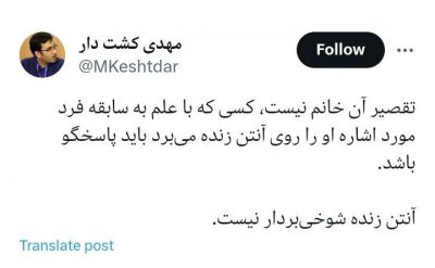 مهدی کشت دار: تقصیر آن خانم نیست، کسی که با علم به سابقه فرد مورد اشاره او را روی آنتن زنده میبرد باید پاسخگو باشد. آنتن زنده شوخیبردار نیست.