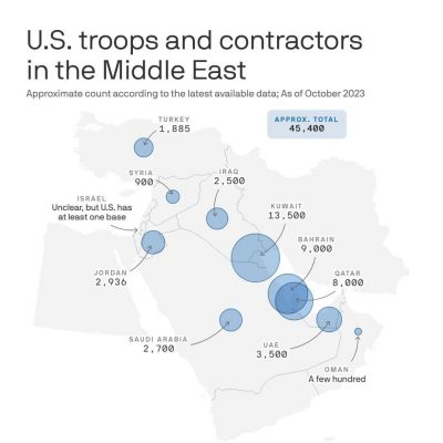 🔹وبسایت خبری آکسیوس بعد از حملات نیروهای مقاومت به پایگاههای نظامی آمریکا در شرق سوریه و شمال عراق، مکان و تعداد ۴۵ هزار نیرو نظامی و پیمانکاران مرتبط با ارتش آمریکا براساس هر کشور را منتشر کرد. 🔹بیشترین تعداد نیروی نظامی آمریکا به ترتیب در کشورهای کویت، بحرین و قطر مستقر هستند. 🔹لوید آستین، وزیر…