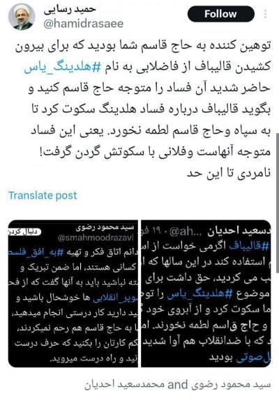 نوشت: 🔹توهینکننده به حاج قاسم شما بودید که برای بیرون کشیدن قالیباف از فاضلابی به نام هلدینگ یاس حاضر شدید آن فساد را متوجه حاج قاسم کنید و بگوید قالیباف درباره فساد هلدینگ سکوت کرد تا به سپاه و حاج قاسم لطمه نخورد. یعنی این فساد متوجه آنهاست و فلانی با سکوتش گردن گرفت! نامردی…
