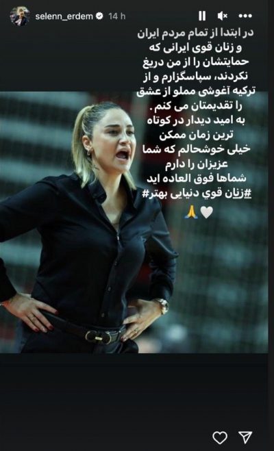 سلن اردم سرمربی مشهور بسکتبال ترکیه که این روزها ویدیوهای او مورد توجه کاربران ایرانی اینستاگرام قرار گرفته است، با انتشار یک استوری به زبان فارسی از حامیان ایرانی خود تشکر کرد.