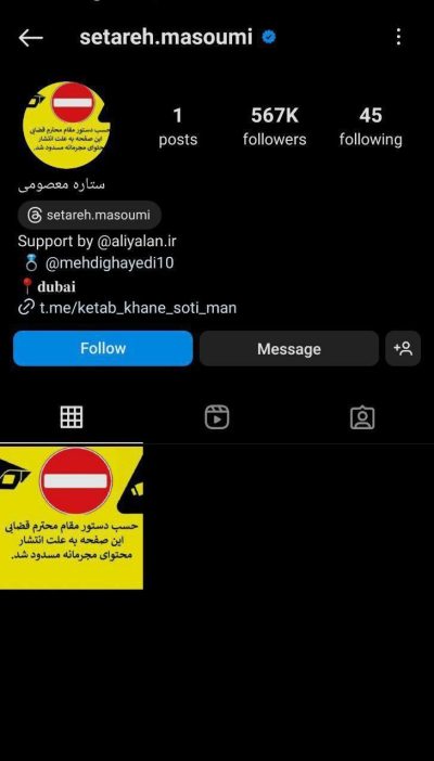 🔹پیج ستاره معصومی همسر سابق مهدی قائدی به دلیل انتشار محتوای مجرمانه توسط مقام قضایی بسته شد.