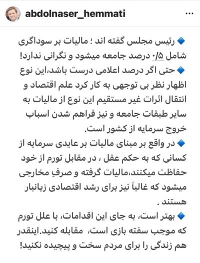 🔹عبدالناصر همتی رییس پیشین بانک مرکزی نوشت: رئیس مجلس گفته اند؛مالیات بر سوداگری شامل ۰/۵ درصد جامعه میشود و نگرانی ندارد! 🔹حتی اگر درصد اعلامی درست هم باشد، این نوع اظهار نظر بی توجهی به کار کرد علم اقتصاد و انتقال اثرات غیر مستقیم این نوع ازمالیات ها به سایر طبقات جامعه و فراهم شدن…
