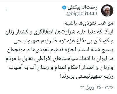 رحمتاله بیگدلی فعال رسانه ای نوشت: 🔹اینک که دنیا عليه شرارتها، اشغالگری و کشتار زنان و کودکان بیدفاع غزه توسط رژیم صهیونیستی بسیج شده است، اجازه ندهیم نفوذیها و مرتجعان در ایران با اتخاذ سیاستهای افراطی، تقابل با مردم و زنان و اصدار احکام تند اعدام و زندان آب به آسیاب رژیم صهیونیستی بریزند!