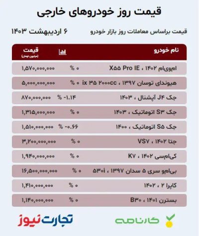 🔹نگاهی به بازار امروز، پنجشنبه، ششم اردیبهشت نشان میدهد قیمت خودرو در اکثر محصولات روند نزولی دارد. در این میان محصولاتی هم به چشم میخورند که بدون تغییر قیمت نسبت به روز گذشته معامله میشوند./تجارتنیوز