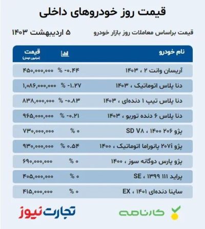 🔹قیمت خودرو امروز، چهارشنبه ۵ اردیبهشت ۱۴۰۳، دومین روز نزولی خود را تجربه میکند. اغلب محصولات در بازار کاهشی گزارش میشوند، اما تعداد معدودی از آنها، صعودی یا بدون تغییر معامله میشوند