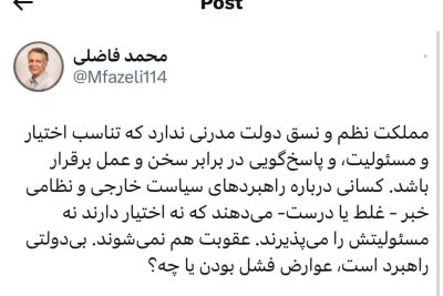 محمد فاضلی: 🔹مملکت نظم و نسق دولت مدرنی ندارد که تناسب اختیار و مسئولیت، و پاسخگویی در برابر سخن و عمل برقرار باشد. کسانی درباره راهبردهای سیاست خارجی و نظامی خبر – غلط یا درست- میدهند که نه اختیار دارند نه مسئولیتش را میپذیرند. عقوبت هم نمیشوند. بیدولتی راهبرد است، عوارض فشل بودن یا چه؟