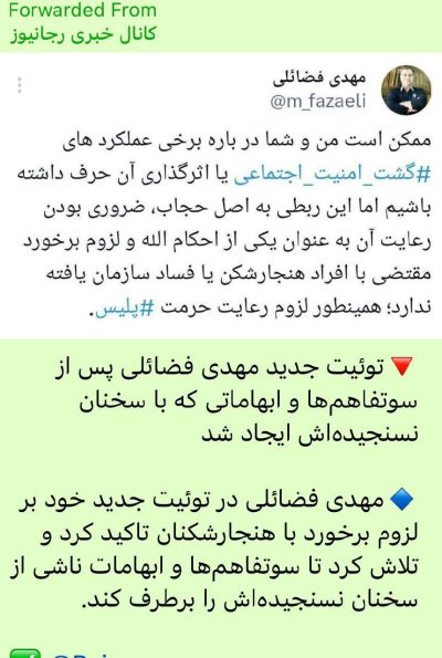 ✍️مُصطفی فقیهی 🔹حملهی عضو دفتر رییسی به عضو دفتر رهبر [فضائلی] با عنوانِ «اطرافیان هتاک برخی مسئولین» که «در مراکز حساس، نفوذ کرده و جا دارد» این مسئولین «متوجه اطرافیان کذاب خود» شوند. 🔹پرخاشِ سایتِ برادر دامادِ رییسی نیز نشان میدهد، نزدیکانِ پُراعتماد به نفسِ رییسِ دولت ۱۳، زیادی به آیندهی سیاسی خود اطمینان دارند.