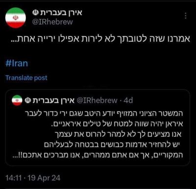🔹توییت حساب ایران به عبری: گفتیم به نفع شماست که حتی یک گلوله هم شلیک نکنید…