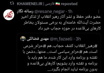 حساب رسمی دفتر رهبر انقلاب ،توئیت مربوط به خبر تذکر به مسئولین بابت گشت ارشاد را بازنشر کرد
