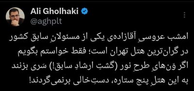 🔹علی قلهکی در توییتی نوشت: امشب عروسیِ آقازادهی یکی از مسئولانِ سابق کشور در گرانترین هتل تهران است؛ فقط خواستم بگویم اگر وَنهایِ طرحِ نور (گشتِ ارشادِ سابق!) سَری بزنند به این هتلِ پنج ستاره، دستِخالی برنمیگردند.