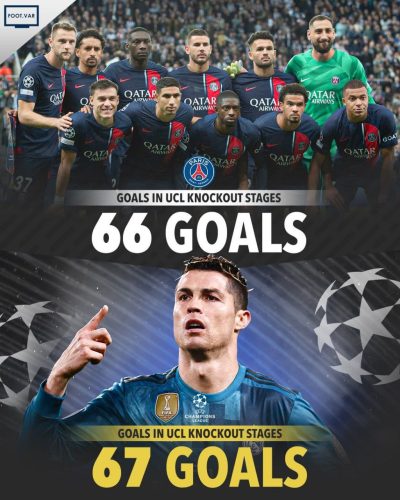 🔹کریستیانو رونالدو در تاریخ مسابقات مرحله حذفی لیگ قهرمانان اروپا بیشتر از تیم پاریسنژرمن گلزنی کرده است