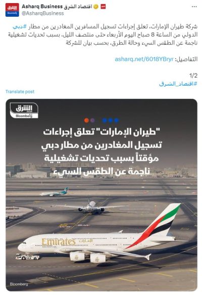 شرکت هواپیمایی امارات امروز اعلام کرد که تمامی سفرها از دبی از ساعت ۸ صبح چهارشنبه تا نیمه شب ۱۸ آوریل به دلیل بدی آب و هوا و وضعیت جاده ها لغو شده است.