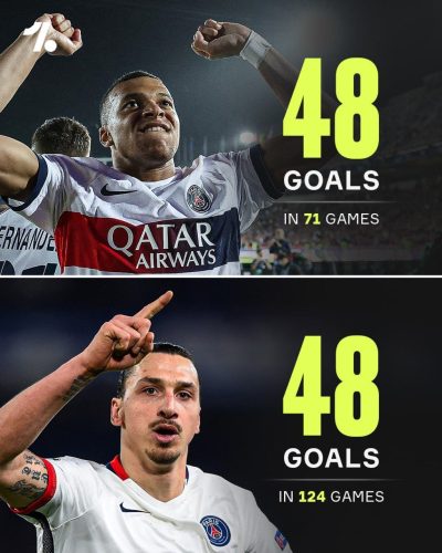 کیلیان امباپه با ۵۳ بازی کمتر از زلاتان در لیگ قهرمانان اروپا به تعداد گلهای ستاره سوئدی (۴۸) در این مسابقات رسید