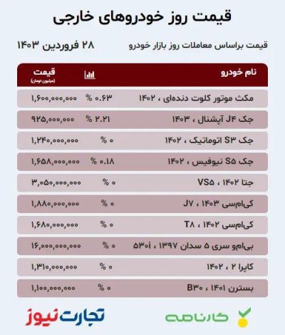 قیمت خودرو ۲۸ فروردین ۱۴۰۳/ کدام خودروی وارداتی ۹۰ میلیون تومان ارزان شد؟