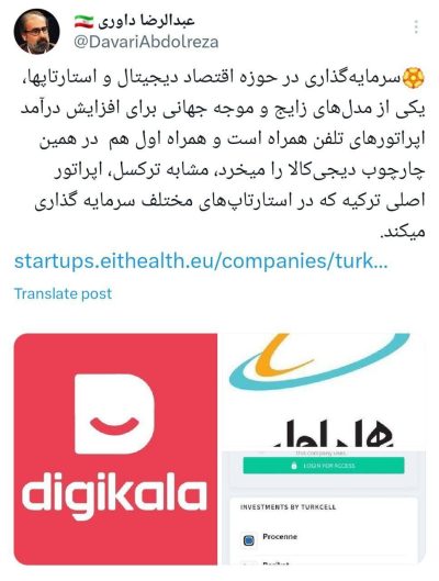 عبدالرضا داوری فعال رسانه ای در واکنش به مذاکرات سرمایهگذاری همراه اول در دیجیکالا نوشت: 🔹سرمایهگذاری در حوزه اقتصاد دیجیتال و استارتاپها، یکی از مدلهای زایج و موجه جهانی برای افزایش درآمد اپراتورهای تلفن همراه است و همراه اول هم در همین چارچوب دیجیکالا را میخرد، مشابه ترکسل، اپراتور اصلی ترکیه که در استارتاپهای مختلف…