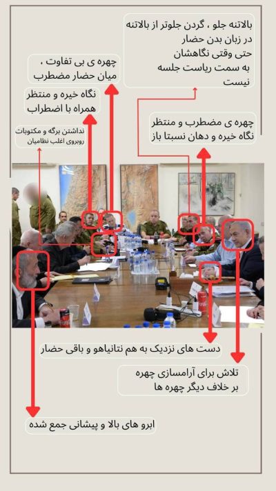 حالات چهره ی نتانیاهو ، بر خلاف دیگر افراد حاضر است ، او تلاش میکند دیگران را آرام سازد و همچنین پیام آرامش را به عکاسان منتقل کند. لبخند یک نفر در جمع و عدم انتقال لبخند و آرامش در چهره دیگر افرادی که او را مشاهده میکنند؛ نشان از مصنوعی بودن لبخند است و…