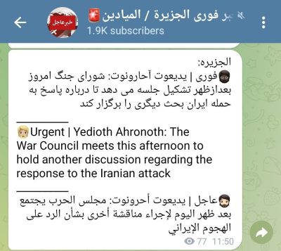 الجزیره: 🔹یدیعوت آحارونوت: شورای جنگ امروز بعدازظهر تشکیل جلسه می دهد تا درباره پاسخ به حمله ایران بحث دیگری را برگزار کند