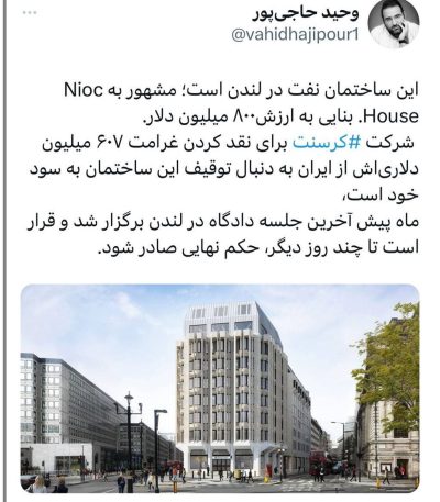 🔹 شرکت کرسنت برای نقد کردن غرامت ۶۰۷ میلیون دلاریاش از ایران به دنبال توقیف این ساختمان به سود خود است، 🔹ماه پیش آخرین جلسه دادگاه در لندن برگزار شد و قرار است تا چند روز دیگر، حکم نهایی صادر شو