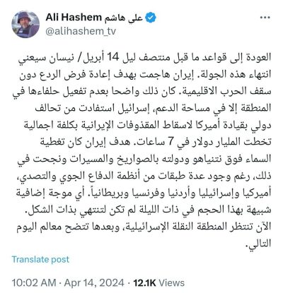 🔹هدف ایران این بودکه آسمان بالای سرنتانیاهو وکشورش را با موشک و پهپاد بپوشاند وعلیرغم وجود لایههای مختلف پدافند هوایی و سامانههای آمریکایی، اسرائیلی، اردنی، فرانسوی و انگلیسی، موفق به انجام این کار شد. 🔹اکنون منطقه منتظر حرکت اسرائیل است.