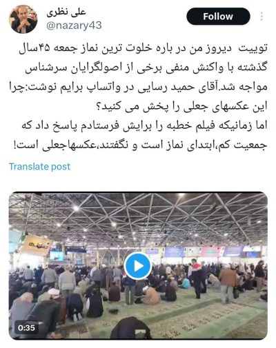 🔹آقای حمید رسایی در واتساپ برایم نوشت:چرا این عکسهای جعلی را پخش می کنید؟ 🔹اما زمانی که فیلم خطبه را برایش فرستادم پاسخ داد که جمعیت کم، ابتدای نماز است و نگفتند، عکسهاجعلی است!