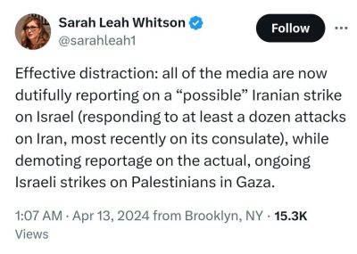 🔹همه رسانه ها از یک حمله “احتمالی ایران به اسرائیل (در پاسخ به حداقل دهها حمله به ایران، آخرین حمله به کنسولگری این کشور) گزارش می دهند، درحالیکه گزارش حملات جدی و مداوم اسرائیل به فلسطینی ها در غزه بتدریج کاهش داده اند.