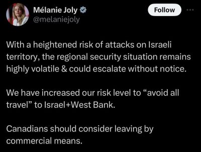 وزیرخارجهی کانادا از اتباع این کشور خواست هر سفری را به اسراییل لغو کرده، و از آن مناطق خارج شوند.