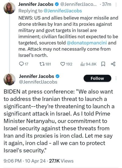 خبرنگار کاخ سفید به نقل از منابع اطلاعاتی و همین طور بایدن در مصاحبه مطبوعاتی دقایقی پیش احتمال پاسخ سریع الوقوع ایران به اسراییل را طرح کردند