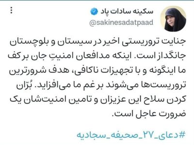 سکینهسادات پاد- دستيار رئيسجمهور: 🔹اینکه مدافعان امنیت با تجهیزات ناکافی هدف شرورترین تروریستها میشوند بر غم ما میافزاید