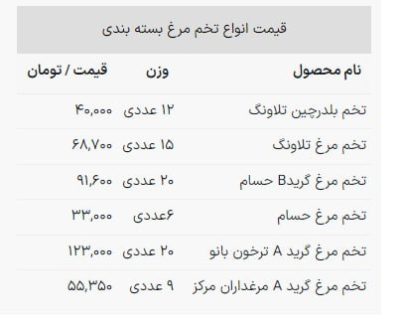 🔹قیمت تخم مرغ بسته بندی شده در بسته ۶ عددی ۳۳ هزار تومان است برای خرید بسته ۹ عددی هم باید ۵۵ هزار تومان پرداخت کنید. بر این اساس خرید بسته های بزرگ تر تخم مرغ به صرفه تر خواهد بود. 🔹قیمت هر شانه تخم مرغ ۲۰ عددی هم امروز ۱۲۳ هزار تومان اعلام شده…
