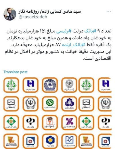 🔹یک فقره فقط بانک آینده ۸۷ هزارمیلیارد معوقه دارد. 🔹 این مدیریت دقیقا خیانت به کشور و موثر در اخلال در نظام اقتصادی است.