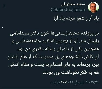 🔹در پرونده محیط زیستی ها خون دکتر سید امامی پایمال شد. او از بهترین اساتید جامعه شناسی و همچنین یکی از داوران رساله دکتری من بود. ایکاش دانشجوهای پل مدیریت که از علم ایشان بهره بردهاند به جای اهتمام به پست و مقام اندکی هم به فکر نکوداشت وی بودند.