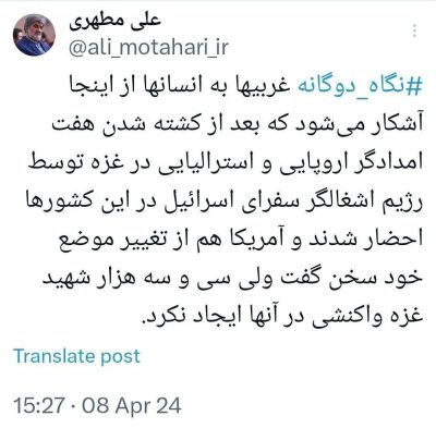 علی مطهری، نماینده سابق مجلس، در واکنش به رویکرد دولت های غربی به جنگ غزه، در یادداشتی در شبکه اجتماعی ایکس نوشت: 🔹نگاه دوگانه غربی ها به انسانها از اینجا آشکار میشود که بعد از کشته شدن هفت امدادگر اروپایی و استرالیایی در غزه توسط رژیم اشغالگر سفرای اسرائیل در این کشورها احضار شدند و…