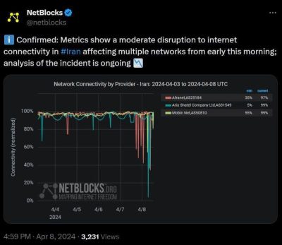 🔹حساب توییتری نتبلاکس در توییتی نوشت: «شاخصها نشان میدهند از اوایل صبح امروز، اختلال متوسطی در اینترنت ایران بر چندین شبکه تاثیر میگذارد. بررسی این رویداد ادامه دارد.» 🔹در تصویر رادار نتبلاکس، اختلال در اپراتورهای شاتل، مبیننت و افرانت دیده میشود.
