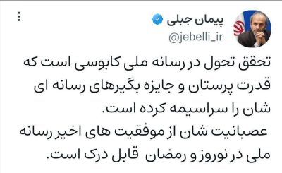 🔹جبلی: تحقق تحول در رسانه ملی کابوسی است که قدرت پرستان و جایزه بگیرهای رسانه ای شان را سراسیمه کرده است. عصبانیت شان از موفقیت های اخیر رسانه ملی در نوروز و رمضان قابل درک است