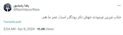 واکنش رضا رشید پور به اظهارات رییس کل بانک مرکزی: جناب فرزین فرمودند جهش دلار زودگذر است. عمر ما هم