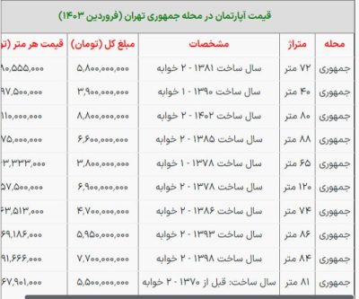 🔹یک واحد آپارتمان ۱۰۰ متری دو خواب در جمهوری در حالی که هفت سال از ساخت آن میگذرد، به قیمت هشت میلیارد و ۴۴۹ میلیون تومان به فروش میرسد. 🔹آپارتمان دیگری با دو اتاق خواب و متراژ ۸۲ متر با سنی حدود ۲۳ سال، چهار میلیارد و ۲۰۰ میلیون تومان قیمتگذاری شده است. 🔹برای خرید…
