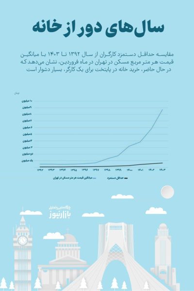 🔹مقایسه حداقل دستمزد کارگران از سال ۱۳۹۲ تا ۱۴۰۳ با میانگین قیمت هر متر مکعب مسکن در تهران در ماه فروردین، نشان میدهد که در حال حاضر، خرید خانه در پایتخت برای یک کارگر، بسیار دشوار است
