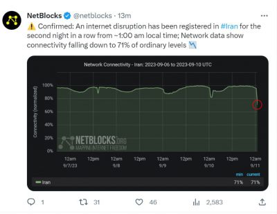 🔹بر اساس دیتای نت بلاکس ساعت ۱ بامداد مجددا همانند شب گذشته، اینترنت ایران دچار اختلال شد. 🔹داده ارائه شده کاهش ثبات اینترنت تا ۷۱٪ را نشان میدهد.