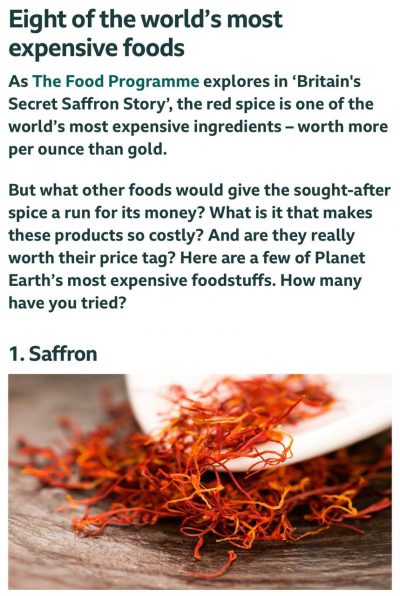 ۱- زعفران ارزش گرمی این ادویه از طلا هم بیشتر است چون گیاه زعفران تنها برای یکی دو هفته در پاییز گل میدهد، برداشت این ادویه نیروی کار زیادی لازم دارد و هر گل تنها سه عدد کلاله دارد. ۲- خاویار خاویار ترشی اشپل ماهی استروژن است. این ماهی رو به انقراض است. خاویار فیلماهی…