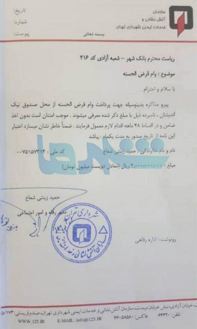 نامه مدیر برای خودش بابت ۲۰۰ میلیون وام قرضالحسنه بدون ضامن/شهرما