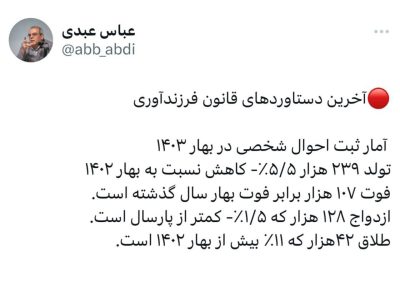 آمار ثبت احوال شخصی در بهار ۱۴۰۳ تولد ۲۳۹ هزار ۵/۵٪- کاهش نسبت به بهار ۱۴۰۲ فوت ۱۰۷ هزار برابر فوت بهار سال گذشته است. ازدواج ۱۲۸ هزار که ۱/۵٪- کمتر از پارسال است. طلاق ۴۲هزار که ۱۱ درصد بیش از بهار ۱۴۰۲ است.