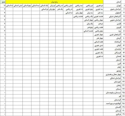 🔹علوم ریاضی: رتبه۱: امیرحسین سلیمانی تازهکندی (تبریز) رتبه۲: امیرمحمد محقق دولتآبادی (تهران) رتبه۳: احسان رضوی (تهران) 🔹علوم تجربی رتبه۱: صبا معصومنیا سماکوش (بندرعباس) رتبه۲: پرهام راسخ (تهران) رتبه۳: سجاد لطفی (مشهد) 🔹علوم انسانی: رتبه۱: علیاکبر قناد یزدی (تهران) رتبه۲: ساغر اسفهبدی (مشهد) رتبه۳: مهرزاد مشایخی (تهران) 🔹زبانهای خارجی: رتبه۱: آیدا دوانی (شیراز) رتبه۲: آرتا اعتمادی…