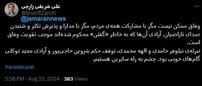 رییس کمیتهی علمی بینالمللی المپیاد جهانی کامپیوتر: 🔹 وفاق ممکن نیست مگر با مشارکت همهی مردم، مگر با مدارا و پذیرش تکثر و شنیدن صدای ناراضیان. آزادی آنها که به خاطر «گفتن» محکوم شدهاند موجب تقویت وفاق است. 🔹تبرئهی نیلوفر حامدی و الهه محمدی، توقف حکم شروین حاجیپور و آزادی مجید توکلی گامهای خوبی بود….