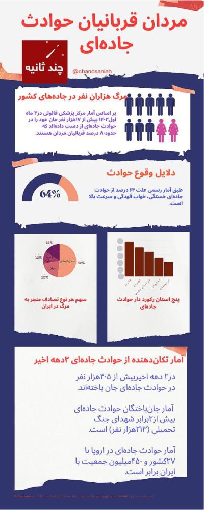 🔹 طبق آمار حدود ۱۵هزار نفر از جانباختگان حوادث جادهای مردان و ۲هزار ۳۱۴نفر از آنها زنان و کودکان هستند. 🔹براساس آمار پلیس راهور در نوروز ۱۴۰۳ روزانه ۵۳نفر در جادههای کشور بر اثر تصادف جان باختهاند. 🔹آمارهای پلیس راهور نشان میدهد که بیشترین تصادف کل سال در ۵روز اول تعطیلات نوروزی رخ میدهد.