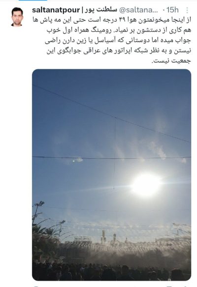 اسماعیل سلطنتپور روزنامهنگار از بینالحرمین نوشت: 🔹از اینجا میخونمتون هوا ۴۹ درجه است حتی این مه پاش ها هم کاری از دستشون بر نمیاد. 🔹رومینگ همراه اول خوب جواب میده اما دوستانی که آسیاسل یا زین دارن راضی نیستن و به نظر شبکه اپراتور های عراقی جوابگوی این جمعیت نیست.